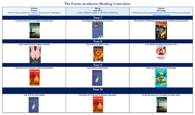 At Future Academies, we value the skill of reading for learning therefore create structured time for students to extend their skill and love of reading as well as improving their wider cultural knowledge of the world around them. Three times a week in tutor time, students are read to, covering three texts across the year.