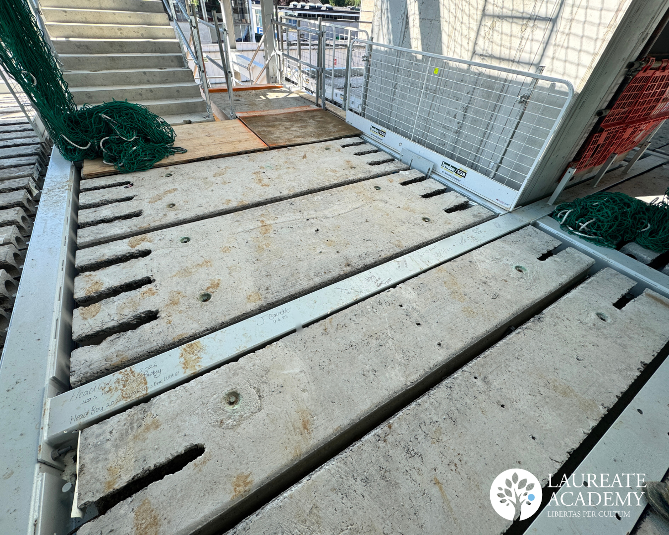 - Inside, screeding of the precast concrete floors is underway, and partitions are being established.